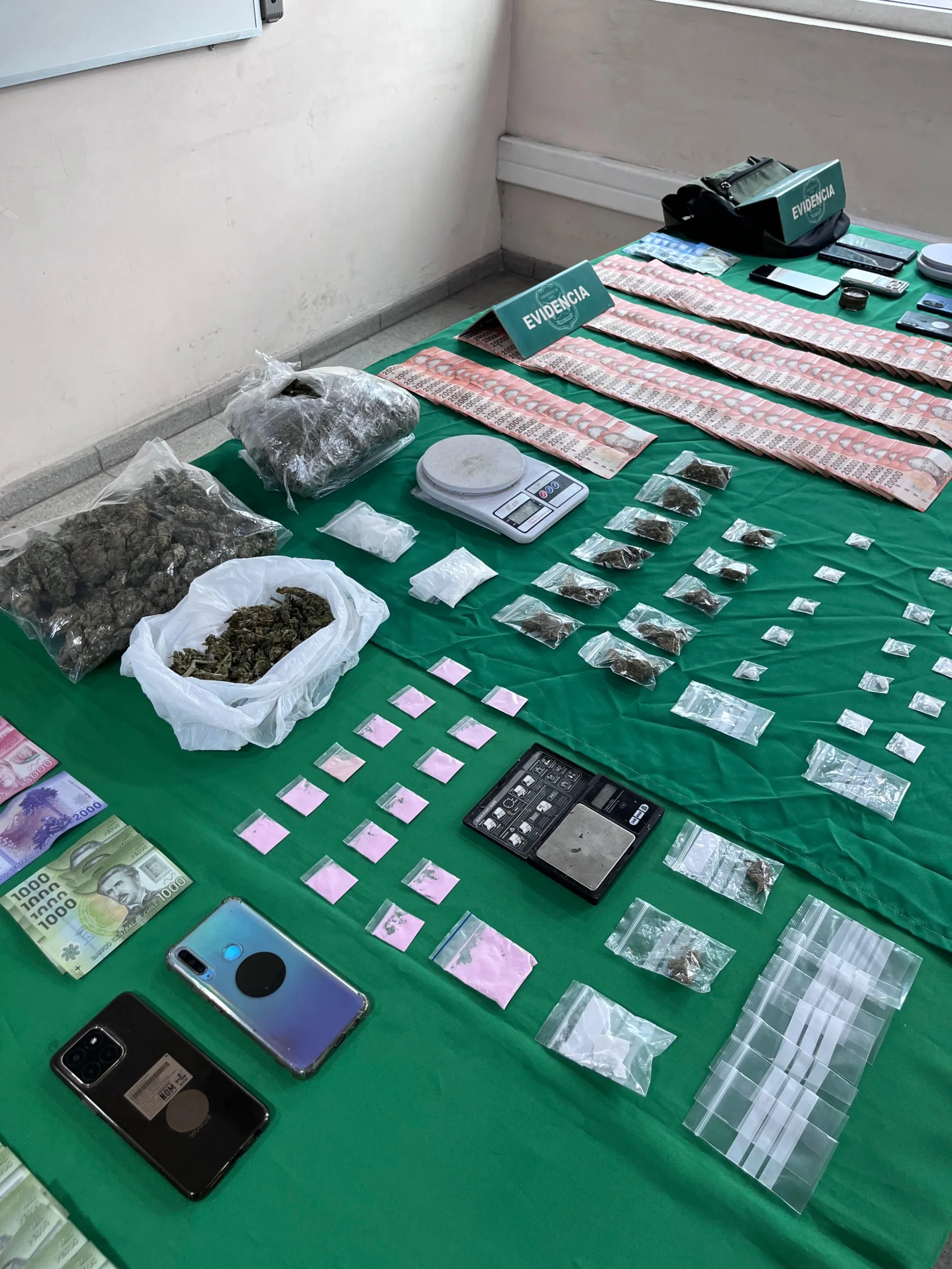 Durante la intervención, los equipos de la Sección de Investigación Policial (SIP) incautaron una significativa cantidad de drogas, entre las que destacan marihuana, ketamina y cocaína. Además, los uniformados lograron confiscar munición no percutada, dinero en efectivo y diversos elementos asociados a la comisión de ilícitos.