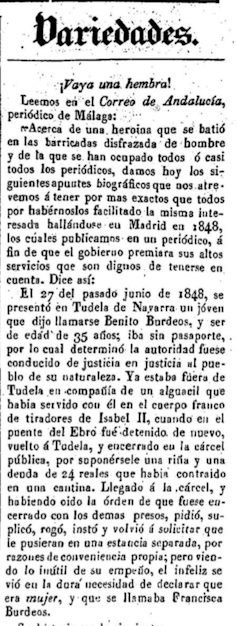 En este sentido, la “transgresión a la feminidad normativa” de Francisca Burdeos es muy peculiar, como ocurre en los casos de mujeres que se mueven entre los márgenes que marcan factores como el sexo, una condición social humilde y un mayor o menor compromiso con ideales progresistas. En ella se unieron la decisión y la valentía para subsistir y alcanzar la independencia personal, lo que la convierte en una adelantada, aparentemente sin pretenderlo, de la lucha por la igualdad y la emancipación femenina. Por ello llaman la atención los parabienes que su comportamiento mereció de la prensa de mediados del XIX.