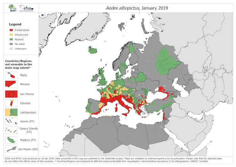 Este insecto también se ha adaptado perfectamente a distintos hábitats, urbanos y periurbanos. En 2004 se detectó por primera vez en España (Sant Cugat del Vallés, Cataluña) y de allí se distribuyó progresivamente por la costa del Mediterráneo, aprovechando los coches como transporte. La invasión de nuevas áreas ha provocado preocupación en salud pública, ya que es vector de al menos 26 virus diferentes, causantes de enfermedades como dengue, zika y chikunguña.