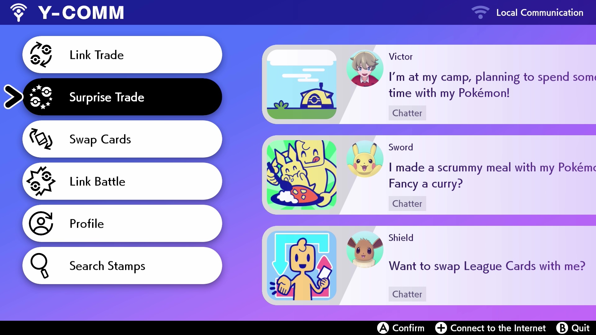 Con esta nueva forma de intercambiar Pokémon, el jugador solo tiene que seleccionar un Pokémon de sus cajas y el juego se encargará de encontrarle automáticamente otro jugador con el que realizar el intercambio mientras prosigue su aventura.