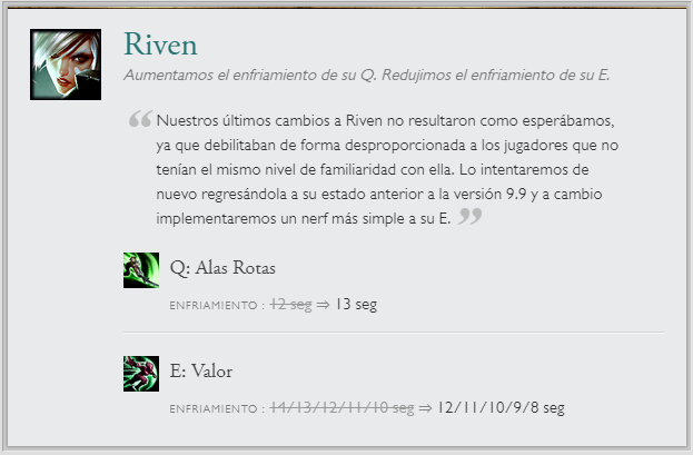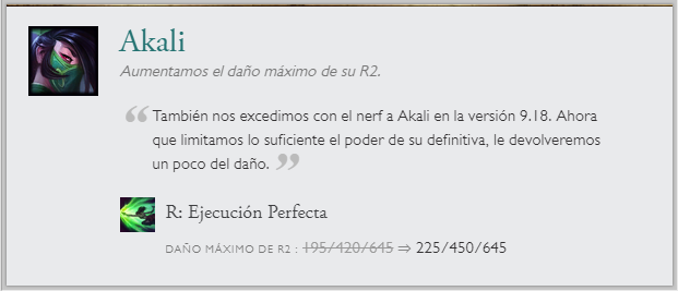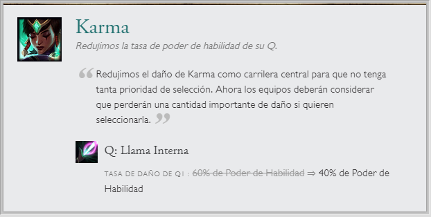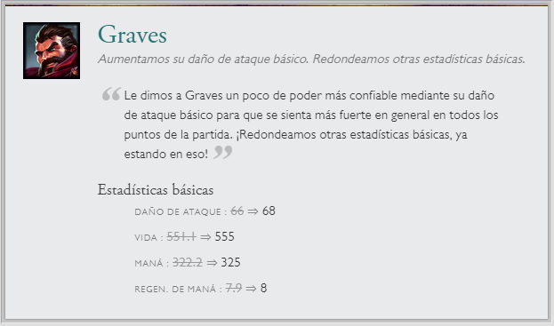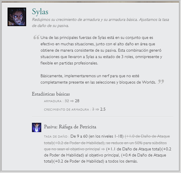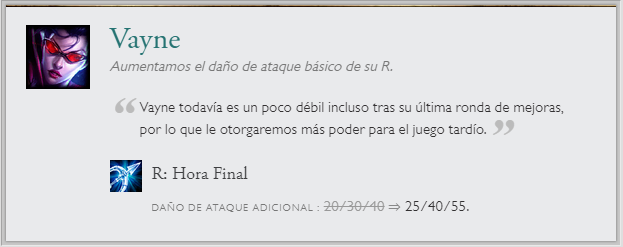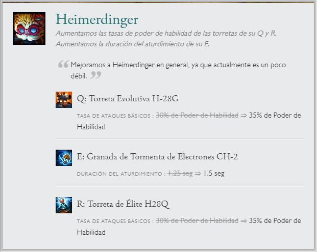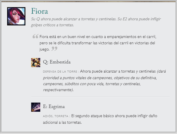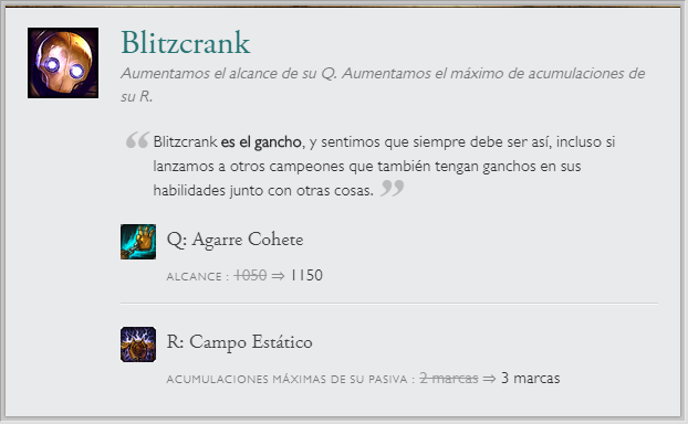 Son 26 los campeones que recibirán cambios antes del mundial. Aunque con más buffs que nerfs en esta oportunidad, pero son a campeones que no estaban en el meta hace bastante tiempo. Algunos cambios importantes son para Blitzcrank que recibe un buff a su Q y ahora sí que su gancho lo representa más, Fiora por su parte podrá hacer dañó con su Q a torres y centinelas y su E podrá pegar más daño a torres.