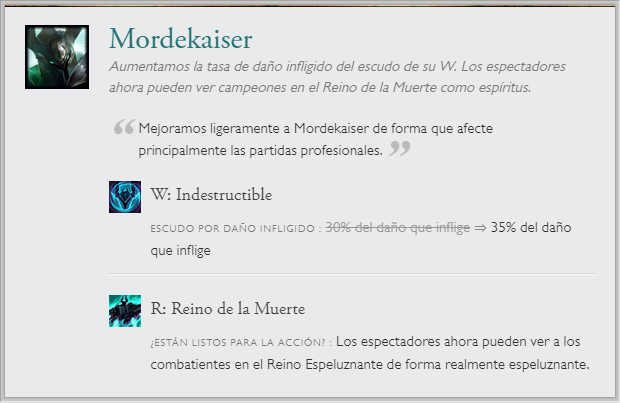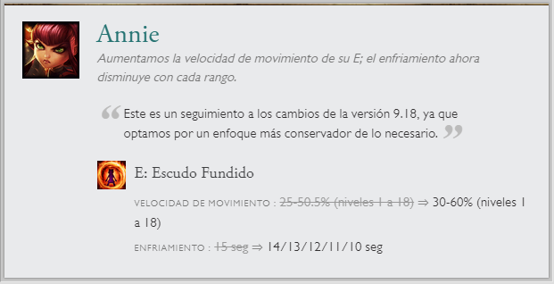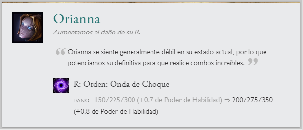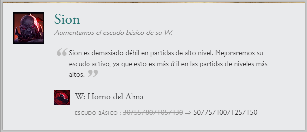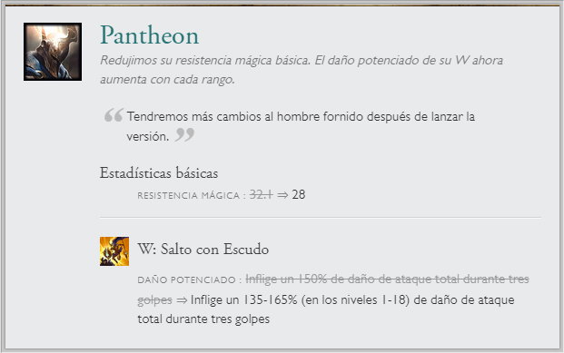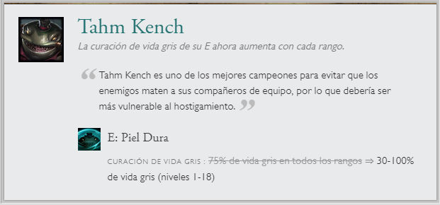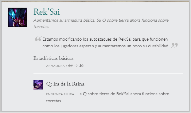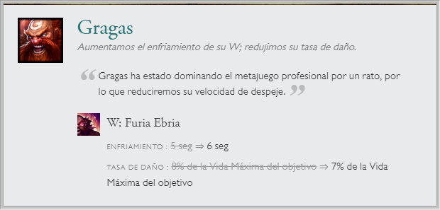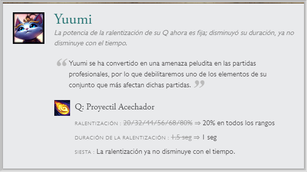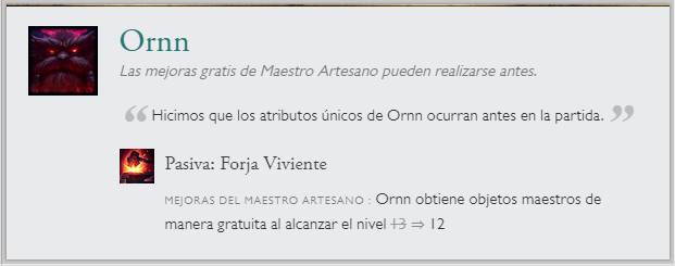 Son 26 los campeones que recibirán cambios antes del mundial. Aunque con más buffs que nerfs en esta oportunidad, pero son a campeones que no estaban en el meta hace bastante tiempo. Algunos cambios importantes son para Blitzcrank que recibe un buff a su Q y ahora sí que su gancho lo representa más, Fiora por su parte podrá hacer dañó con su Q a torres y centinelas y su E podrá pegar más daño a torres.